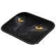 Unique car floor mat set with a black cat with hypinotic orange yellow eyes print, against a black background. Can be personalized by adding your name or other text. Makes a unique gift for someone special.