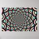 This is a captivating abstract image featuring a repetitive pattern of concentric, layered arch or scale-like shapes arranged to create an optical illusion of depth, pulling the viewer towards a central point. Each curved element is composed of bands of light blue, soft pink, and pale yellow, outlined in black. Small black dots are placed within the innermost colored band of each shape unit. The pattern repeats outwards on a solid black background, creating a dizzying, tunnel-like effect. The overall style is graphic, geometric, and distinctly psychedelic, designed to be visually striking and somewhat disorienting. (designed by freepik)