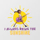 This vibrant graphic from "Gracie & Pedro: Pets to the Rescue!" features Sophie bursting with energy and charisma, as she plays her guitar with a radiant sunburst backdrop. The phrase "I Always Bring the Sunshine" encapsulates her optimistic and lively spirit, perfectly suited for a musical moment in the film. Her stylish outfit and bright purple guitar highlight her unique personality and role as a source of joy and inspiration. Ideal for merchandise targeting young audiences, this image embodies the positivity and fun of the movie, making it a great addition to any fan’s collection.