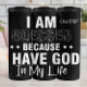 This design powerfully declares "I AM BLESSED BECAUSE I HAVE GOD In My Life." "BLESSED" features a striking dotted texture, while "BECAUSE" is highlighted with diamond accents. The overall black and white palette and strong typography convey a profound message of gratitude and divine presence.