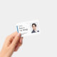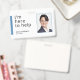 A modern ID badge for volunteers using the phrase "I'm here to help" as the introduction text. The badge design includes the volunteers ID photo as well as the volunteers name. The back shows the name of the event or organization. This badge would also work great for sales staff.