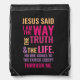 Drawstring Backpack in bright writing with the biblical verse from John 14:6 Jesus told him, “I am the way, the truth, and the life. No one can come to the Father except through me". The verses are in orange red & pinkish colors and in mixed calligraphy & minimalist typography. This trendy, modern faith design is the perfect gift and fashion statement. #christian #religion #scripture #faith #bible #jesus