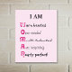 An inspiring poster for you to declare how wonderful you are! The letters of WOMAN each form the initial letter of a powerful phrase to describe what it is to be a woman. I am Warm hearted, Open minded, Multi talented, Awe inspiring, Nearly perfect! In black and pink script text on a purplish pink background