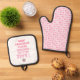 NewParkLane - Oven mitt & pot holder set, with a funny sarcastic quote 'I bake because punching people is frowned upon' in modern gradient / ombre hot pink typography, with a little cupcake on the holder set. On the Oven mitt a cool pink aztec pattern.