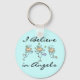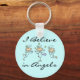 Three stick figure angels and black text that reads "I Believe in Angels" on a blue background on an angel keychain sure to delight anyone who loves angels and stick figures!