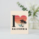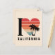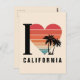 Send a little sunshine from the Golden State with this stylish postcard featuring a bold I ❤️ California design on a warm antique white background. The eye-catching layout includes a large “I,” a retro-striped heart in sunset-inspired hues (red, orange, taupe, green, teal, and blue), breezy palm trees, and customizable text—perfect for showcasing your favorite California beach town like Santa Monica, Pismo Beach, San Francisco, or anywhere you call home.
