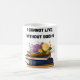 An original illustration of old and rare books in muted colors with ornate, gilded spines, as if viewing a shelf in an old library. Customizable text lines can be personalized, but are shown with the famous Thomas Jefferson quote, "I cannot live without books." A fitting mug for any book lover, scholar, librarian, teacher or student that loves books and reading.