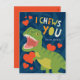 Cute Valentine's Day card for kids featuring an illustration of a green t-rex holding a red heart on a blue background with the words "I choose you". Design by Shelby Allison.