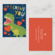 Cute Valentine's Day card for kids featuring an illustration of a green t-rex holding a red heart on a blue background with the words "I choose you". Design by Shelby Allison.