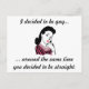 Fully customizable postcard with a cartoon drawing of an old-fashioned housewife, thinking, and the phrase "I decided to be gay... around the same time you decided to be straight." A reply to the bizarre question "When did you decide you were gay?" This postcard is doing its bit to educate ... and amuse at the same time! ;)