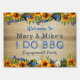 This rustic I DO BBQ engagement party outdoor yard sign will welcome your loved ones to your engagement party This fun and rustic barn wood-themed design features a light-colored wood with a row of pretty boho sunflowers and blue feathers on the top and bottom of the banner. Personalize with both of your first names for a beautiful country boho flair. Other fonts and colors are available.