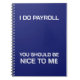 I Do payroll. You Should Be Nice To Me This design helps payroll professionals stay organized and on top of their game by tracking their insights, strategies, and brilliant ideas.