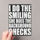 Show off your fun relationship dynamic with this bold quote that says “I Do The Smiling, She Does The Background Checks.” This funny women’s t-shirt is perfect for girlfriends and wives who love to protect their partners and secretly investigate new people. Great gift idea for anniversaries, Valentine’s Day, dating nights, or any woman with a playful sense of humor.