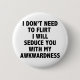 I Don’t Need To Flirt I Will Seduce You With My Awkwardness button. The phrase “I don’t need to flirt I will seduce you with my awkwardness” printed in Abadi MT Condensed Light Font. A great geek humor gift for shy and socially awkward people.