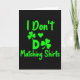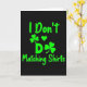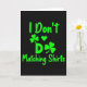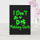 This greeting card features a deep black background with neon green lettering that stands out like a glowing sign 💚. The message is arranged in three lines, with “I Don’t” at the top, the clever “Do” construction in the middle, and “Matching Shirts” along the bottom. In the middle line, a bright three-leaf shamrock replaces the “o” in “Do,” followed by a small heart that adds a gentle, affectionate touch between the words ☘️. A capital “D” sits nearby with another shamrock element, making the wordplay feel like a quiet inside joke shared by close friends or a couple who like doing things their own way. The text is centered and evenly spaced, keeping the layout simple so the glowing green shapes and letters do all the talking. The shamrocks are the same neon green as the letters, while the heart is smaller and placed right where your eye naturally pauses. The overall look stays minimal, with crisp edges on the letters and two shamrock icons tucked into the middle line against the solid black field.