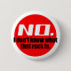 This flair button pin features a red logo with the text "No. I don't know what that rock is." For those who receive too many requests to name mysterious rocks.