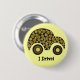 Cute button to celebrate passing the driver's test. Black car covered with yellow flowers on a yellow background, with the words, "I Drive!"