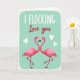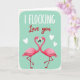 This greeting card shows two pink flamingos standing face to face, their long curved necks meeting to form a heart shape in the center. The birds are shaded in rich fuchsia and soft pink tones, with dark-tipped beaks that add contrast and detail. Behind them is a gentle mint green background with a lightly textured look that feels like a classic printed card. Small white hearts float around the flamingos, adding a sweet romantic touch. At the top, the message reads “I FLOCKING Love you,” with “I FLOCKING” in white block letters and “Love you” in red script below. The mix of humor and affection makes this card a fun choice for Valentine’s Day, whether for a partner or a close friend ❤️
