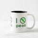 I hate peas. Design, on two tone coffee mug, uses green letters, a green heart and the international "NO" sign to read , "I hate peas". Shows on three sides of mug. For those that do not "heart" them, really dislike them, but have a sense of humor (humour), love to laugh and have their funny bone tickled.