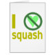 I hate squash. Design on greeting card or note card uses orange-yellow letters, a green heart and the international "NO" sign to read , "I hate squash". For those that do not "heart" it, really dislike it, but have a sense of humor, love to laugh and have their funny bone tickled. Add some fun to your correspondence with a funny note card.