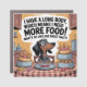 The phrase "I Have A Long Body, Which Means I Need More Food! What’s So Unclear About That" is integrated in a bold, hand-lettered script that wraps above or below the artwork, using playful emphasis on “Long Body” and “More Food!” The color palette is warm and inviting, featuring browns, soft reds, and hints of gold or teal to create an upbeat and eye-catching visual.