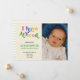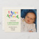 I have arrived! Fun colorful letters announcing the birth of your new baby and featuring your favorite photo of your new baby! Customize this design with your photo, baby's first, middle and last name, birth date, time, weight and length.