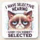 A playful and sarcastic design featuring a Himalayan cat with stunning blue eyes, brown and tan fur, and flowers adorning her ears. With a frown on her face, the cat is paired with bold black text that reads, "I have selective hearing. Sorry you weren't selected." This lively design is available on a range of products, making ideal gifts for cat lovers.
