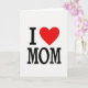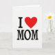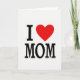 This card keeps things simple on a bright white background, letting a direct message speak through shape and contrast. Near the center, a large black “I” sits to the left, followed immediately by a rich red heart ❤️ that stands in for the missing word and feels like a quiet, affectionate gesture. To the right of the heart, “MOM” appears in strong black letters, giving the message a steady, respectful tone. The spacing between the three elements leaves plenty of open space, like a calm pause that makes the love feel unforced and close. The high contrast between the black text and the white field makes the words easy to read at a glance, while the heart becomes the warm focal point. With no extra illustrations, the design suggests a straightforward bond—like a hug that doesn’t need many words—while still feeling tender and sincere. A small touch of warmth comes from the single red symbol, almost like a little flower of color 🌼 against the white. The layout reads left to right as “I” in black, a solid red heart, and “MOM” in black, all aligned neatly across the middle.