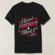 My 11 yo wore adult XL (5’7” 165#). The 8yo is small framed. She wore adult small and tied it in the back. Grandma wore adult large with long sleeve shirt underneath. Tall girl adult medium. Dark haired male adult large. Good quality dark Heather gray, Gildan brand shirt. -it was next up from basic choice and cost about $20 per shirt. Not too thick or thin. Washed and dried well, no major shrinkage. Not see-through. Can wear a bra under it fine. Screen print is just as shown and well done, front and back.