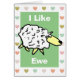 I like you fun card with a sheep. Funny sheep cartoon card says "I Like Ewe" - a pun. Personalise with inside message. Say I like you to someone. I like you card with an illustration of a sheep.