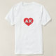 This shirt features a vibrant red heart containing the bold white upper case letters AK, the official abbreviation for Alaska, the last frontier.
