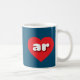This mug features red hearts containing the bold, rounded, white lower case letters ar, a playful version of the abbreviation for Arkansas, the natural state.