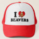 This funny beaver hat reads I Love Beavers in black with a cute cartoon beaver over the red heart. A cute team mascot cap for a school with a sense of humor.