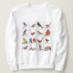A whole bevy of beautiful, vibrant songbirds cover the front of this sweatshirt, the perfect garment for bird enthusiasts!