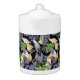 Original fine art design of pet Cockatiel parrots in Forget Me Nots by artist Carolyn McFann printed on a medium teapot for avian art fans.