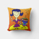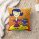 Colorful throw pillow with peach, orange and red background and a drawing of a woman with blue hair and round earrings smiling. She has a retro dress and a fun happy vibe. Huge cup of coffee next to her on a coffee table. It's has a very happy, vibrant feel. Great gift for anyone that loves coffee, girlfriends, mom, aunt, grandmother.