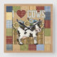 A cute design of a cow with sunflowers on a background of country patchwork and burlap, with the text art I Heart Cows. Makes a perfect gift idea for someone who loves cows, lives on a farm or smallholding or who just likes country style decor and accessories.