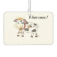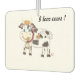 A custom car air freshener in the shape of a heart . It has the illustation of a white and black Swiss cow and the words "I love cows !" are written in black letters above it . Remember to choose your favorite smell :) © ArianeC Illustrations