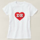This t-shirt features a vibrant red heart containing the bold, white, upper case letters DE, the official abbreviation for Delaware, the first state.