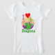 Cute I Heart (Love) Dragons T-Shirt. A cute green cartoon dragon with colorful stars, wings and a big star tail and a green fire breathing dragon and pink dragon flying in the sky against a purple pink mountain range and a big red heart with pink love hearts and customizable text "Dragons" I Love Dragons Tee. This super cute dragon tee for children is fully customizable, add your name, texts and images! A great children's dragon gift for the big little dragon fan!