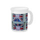 The image showcases a grid-like arrangement of stylized Union Jack flags, each adorned with a central abstract white heart. The flags are set against a light background, emphasizing the flag motif and its variations. The composition is simple and repetitive, creating a visually appealing design.