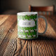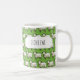 I LOVE EWE! A fun mug design featuring a pattern of sheep, drawn in a blocky, pixel art style. Change the default text to your preferred name, message or caption; text changes are reflected on both sides. Use the editor to change the default, grass green background color.