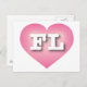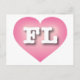 This postcard features a vibrant pink heart with a white washed center containing the bold white upper case letters FL, the official abbreviation for Florida, the sunshine state. The reverse side of the postcard is blank, awaiting your handwritten sentiments or customized text.