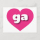 This postcard features a vibrant hot pink heart containing the bold, white, rounded lower case letters ga, a playful abbreviation for Georgia, the peach state. The reverse side of the postcard is blank, awaiting your handwritten sentiments or personalized text.