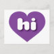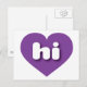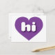 This postcard features a shapely and vibrant purple heart containing the bold, white, rounded lower case letters hi, a playful abbreviation for Hawaii, the aloha state. The reverse side of the postcard is blank, awaiting your handwritten sentiments or customized text.