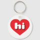 This key chain features a vibrant red heart containing the bold, white, rounded lower case letters hi, a playful abbreviation for Hawaii, the aloha state.