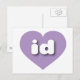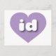 This postcard features a shapely and vibrant lavender heart containing the bold, white, rounded lower case letters id, a playful abbreviation for Idaho, the gem state. The reverse side of the postcard is blank, awaiting your handwritten sentiments and customized text.