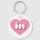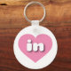 This key chain features a vibrant pink heart containing the bold, white, rounded lower case letters in, a playful abbreviation for Indiana, the Hoosier state.