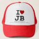This trucker cap has an "I love JB" logo along with 3 web pages