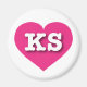 This magnet features a vibrant hot pink heart containing the bold, white, upper case letters KS, the official abbreviation for Kansas, the sunflower state.